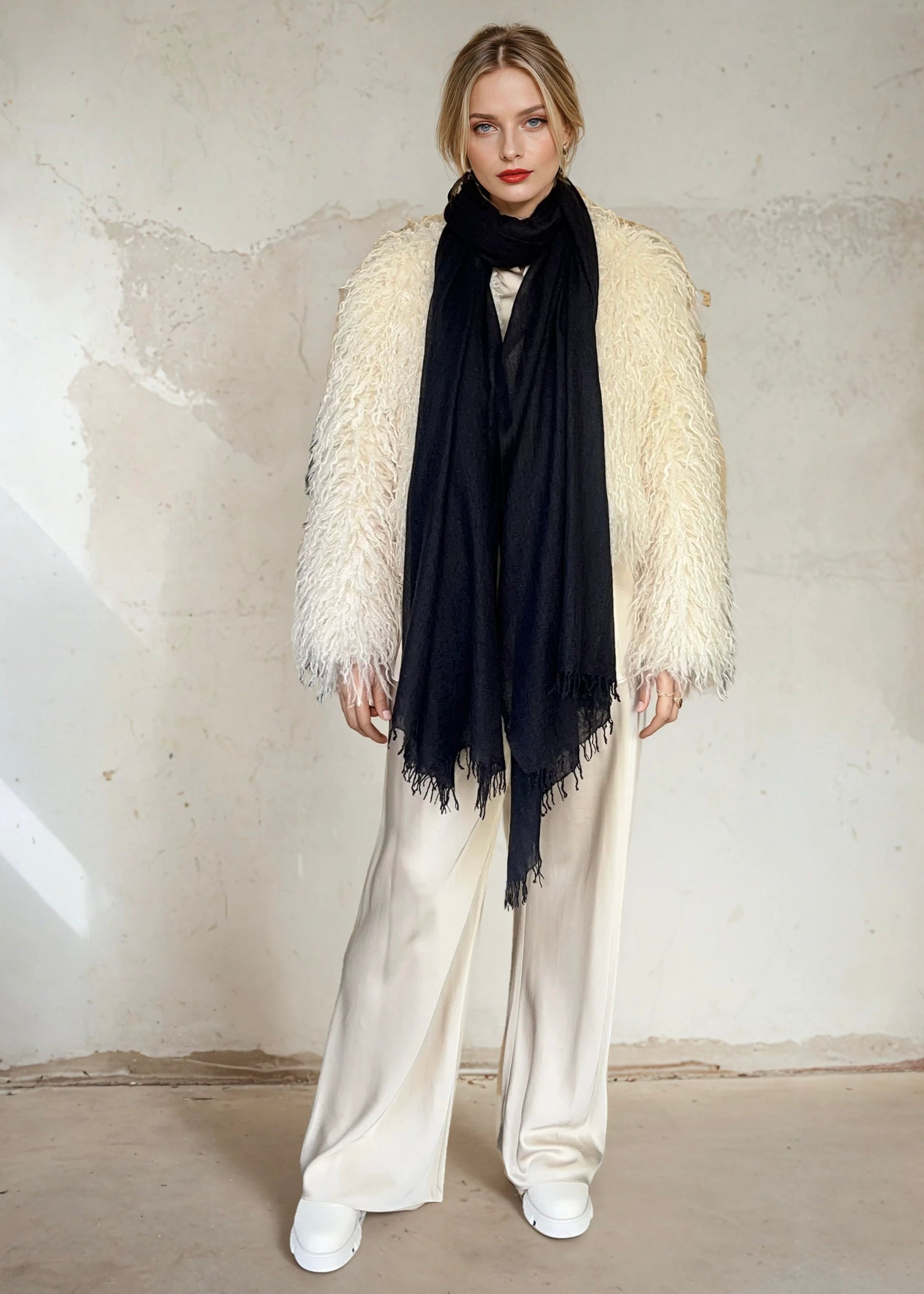 Your classic black hand-loomed over sized pure cashmere scarf come with  it's own Cashmere Luxe travel bag